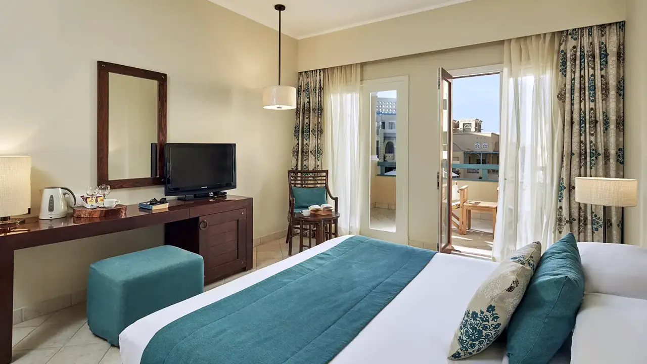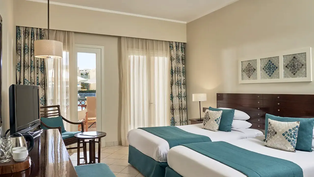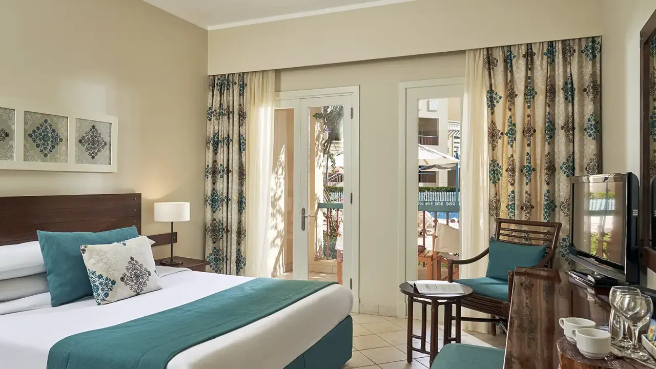الغرف القياسية: تتميز الغرف القياسية بتصميم حديث وبسيط، مع وسائل الراحة الأساسية مثل تلفاز بشاشة مسطحة، ميني بار، وخدمة الواي فاي المجانية. كما تتمتع بإطلالات خلابة على المسبح أو الحدائق، مما يضفي جوًا من الراحة والاسترخاء.