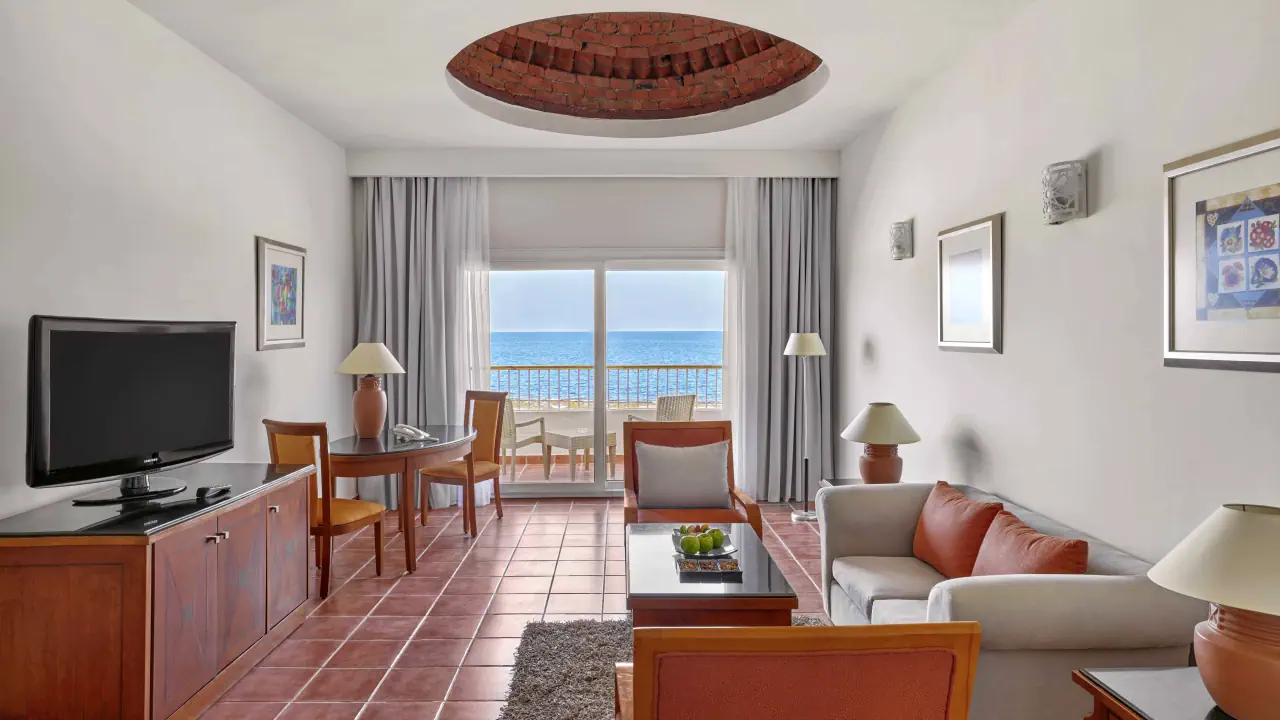 The resort features a range of modern and elegant rooms and suites. Each unit is equipped with air conditioning, a flat-screen TV, a minibar, a safe, and a fully equipped private bathroom. Most rooms also offer private balconies or terraces with views of the sea or pool.