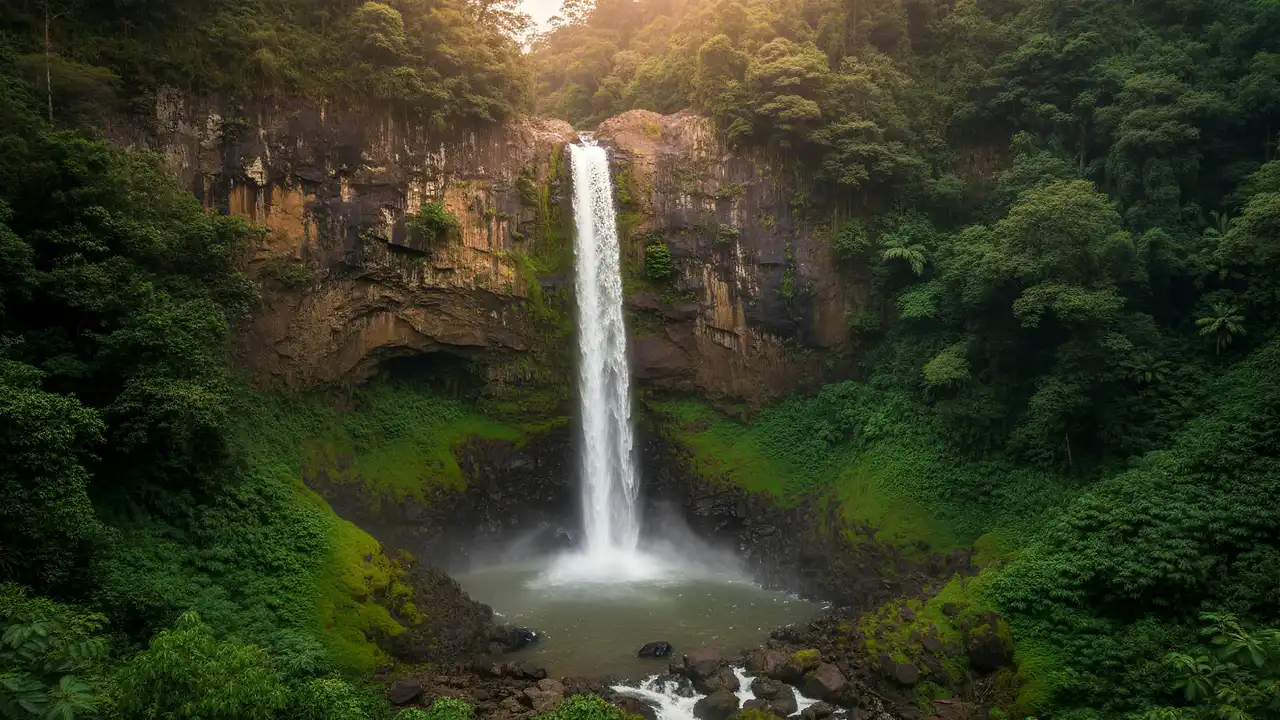 The waterfall cascades from a height of 30 meters, flowing through mountain curves and paths lined with trees and native tea plants.