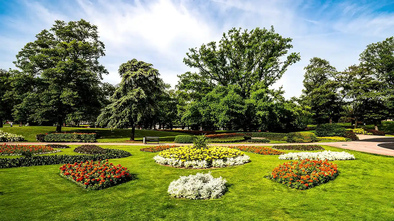 The park is adorned with trees, flowers, and lawns, making it a haven for nature lovers and those who enjoy strolling through expansive green spaces.